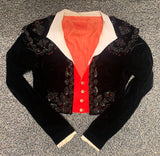 Black velvet cropped jacket with black and red sequin shoulder pads, mock white shirt and red waistcoat.